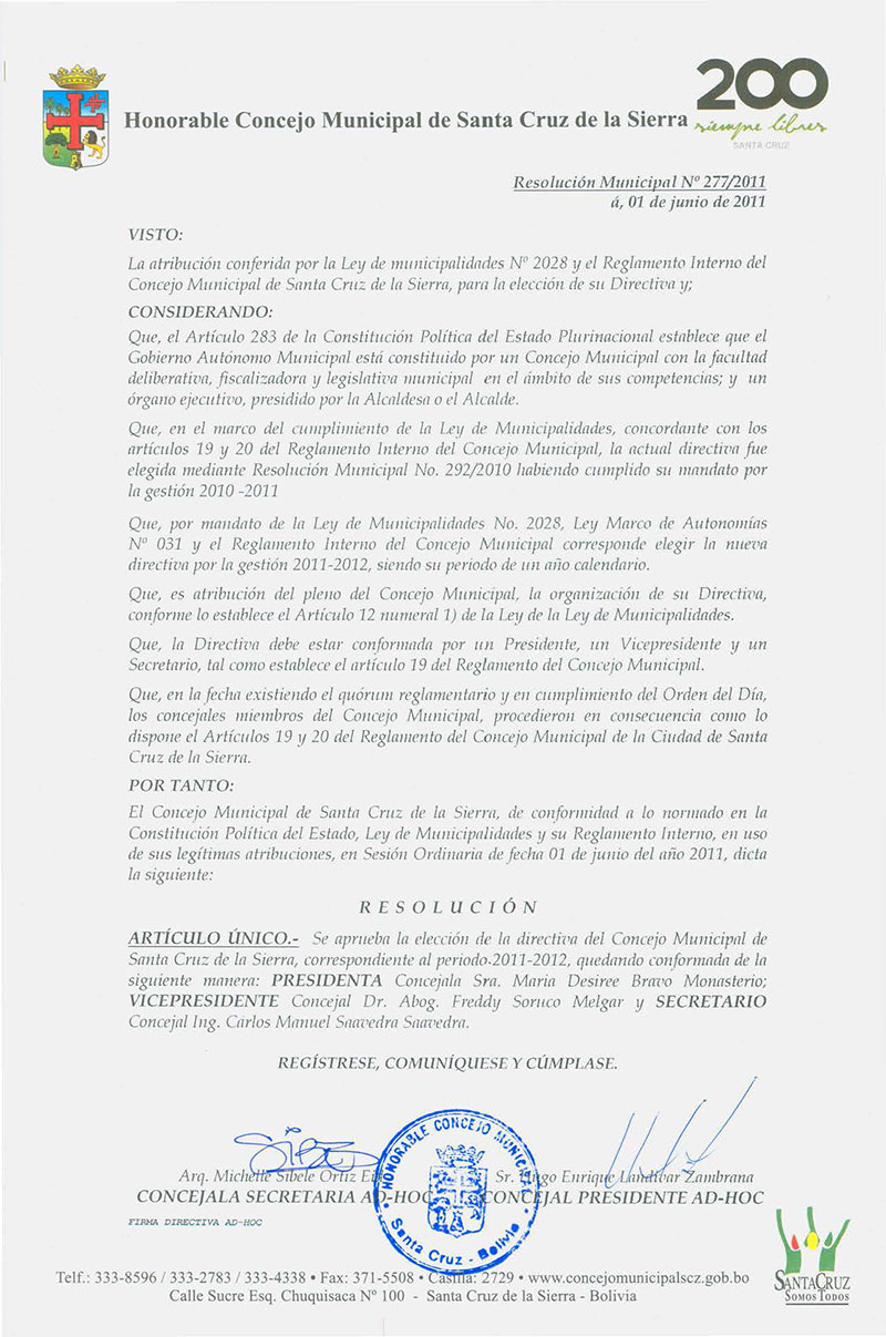 Aprueba la elección de la directiva del Concejo Municipal de Santa Cruz de la Sierra, correspondiente al periodo 2011-2012, quedando conformada: PRESIDENTA Concejala Sra. María Desiree Bravo Monasterio; VICEPRESIDENTE Concejal Gral. Abog. Freddy Soruco Melgar y SECRETARIO Concejal Ing. Carlos Manuel Saavedra Saavedra.