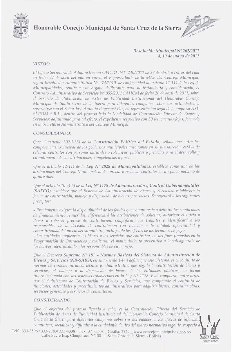 Aprueba el Contrato Administrativo Nº 055/2011 SAHCM, suscrito con la empresa ASÍ-SÍ.POM S.R.L., para la prestación del Servicio relativo a la Publicación de Artes de Publicidad Institucional del Concejo Municipal.