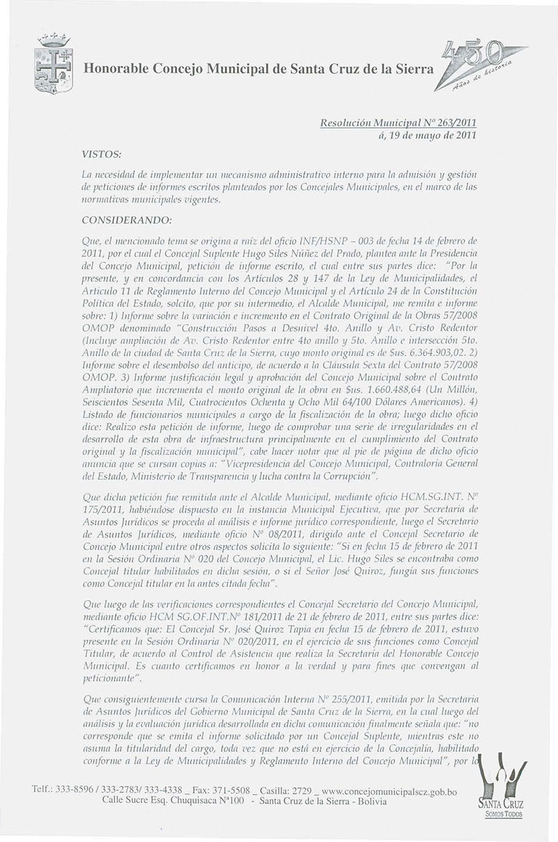 Se instruye a la Secretaria del Concejo Municipal, que con carácter previo a la admisión y consiguiente gestión de peticiones de informes escritos planteados por los Señores Concejales Municipales tanto titulares como suplentes, se verifique que estos se encuentren debidamente habilitados y en pleno ejercicio vigente del cargo o de la concejalía correspondiente, conforme a lo establecido en la Ley de Municipalidades y en el Reglamento Interno del Concejo Municipal de Santa Cruz.