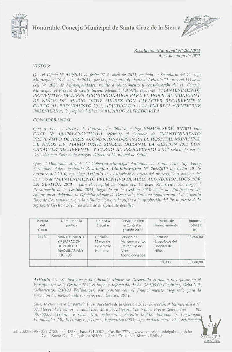 Aprueba el CONTRATO ADMINISTRATIVO OMAF Nº 035/2011 relativo a “SERVICIO DE PUBLICACIÓN DE ARTES Y PRENSA PARA EL GOBIERNO MUNICIPAL DE SANTA CRUZ, ADJUDICADO A LA EMPRESA EDITORIAL RENACIMIENTO “ EL MUNDO”.