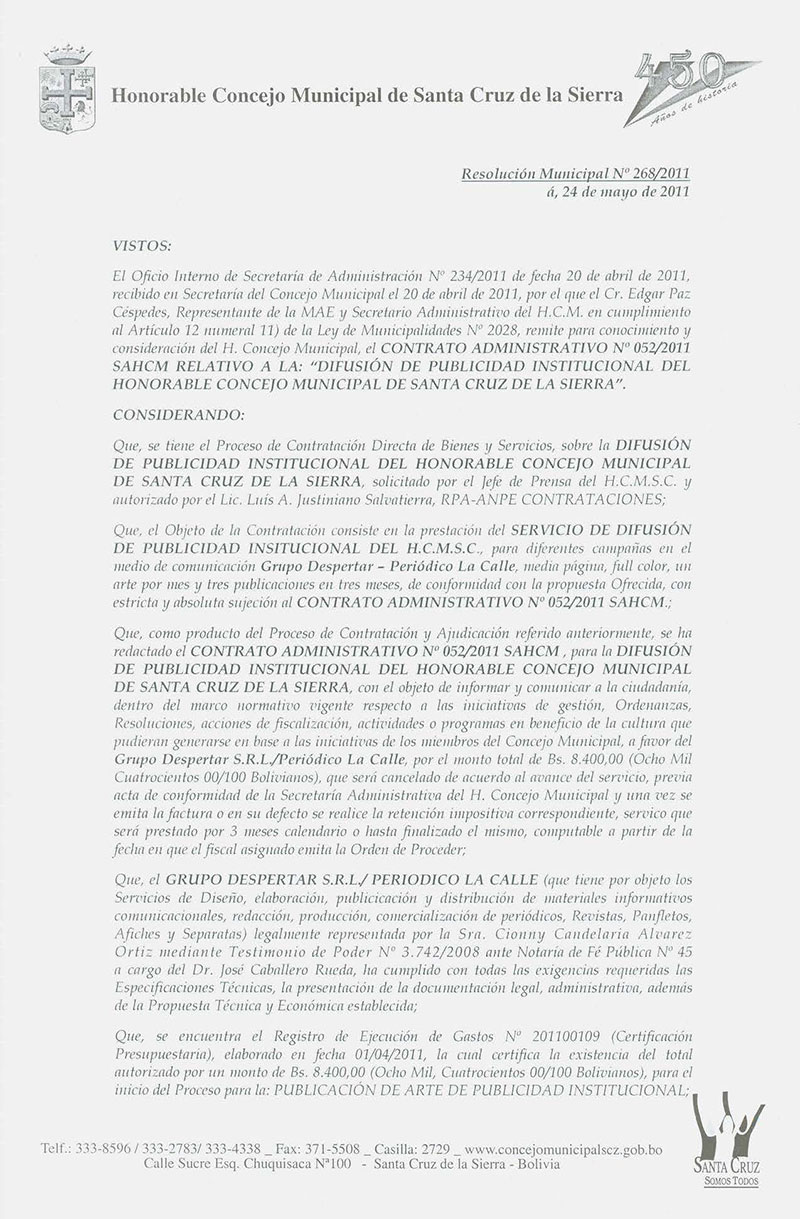 Aprueba el CONTRATO ADMINISTRATIVO Nº 052/2011 SAHCM, para el SERVICIO DE DIFUSIÓN DE PUBLICIDAD INSTITUCIONAL DEL HONORABLE CONCEJO MUNICIPAL DE SANTA CRUZ DE LA SIERRA, a favor del Grupo Despertar S.R.L./Periódico La Calle.