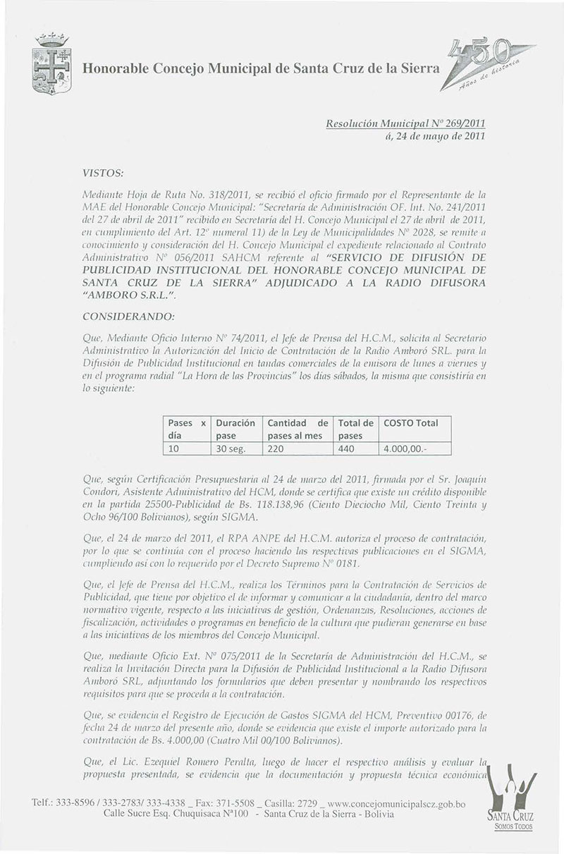 Aprueba el Contrato Administrativo No. 056/2011 SAHCM, para la Contratación Directa del Servicio de Difusión de Publicidad Institucional en Distintas Campañas sujetas a actividades del Concejo Municipal, adjudicado a la Radio Difusora Amboro.