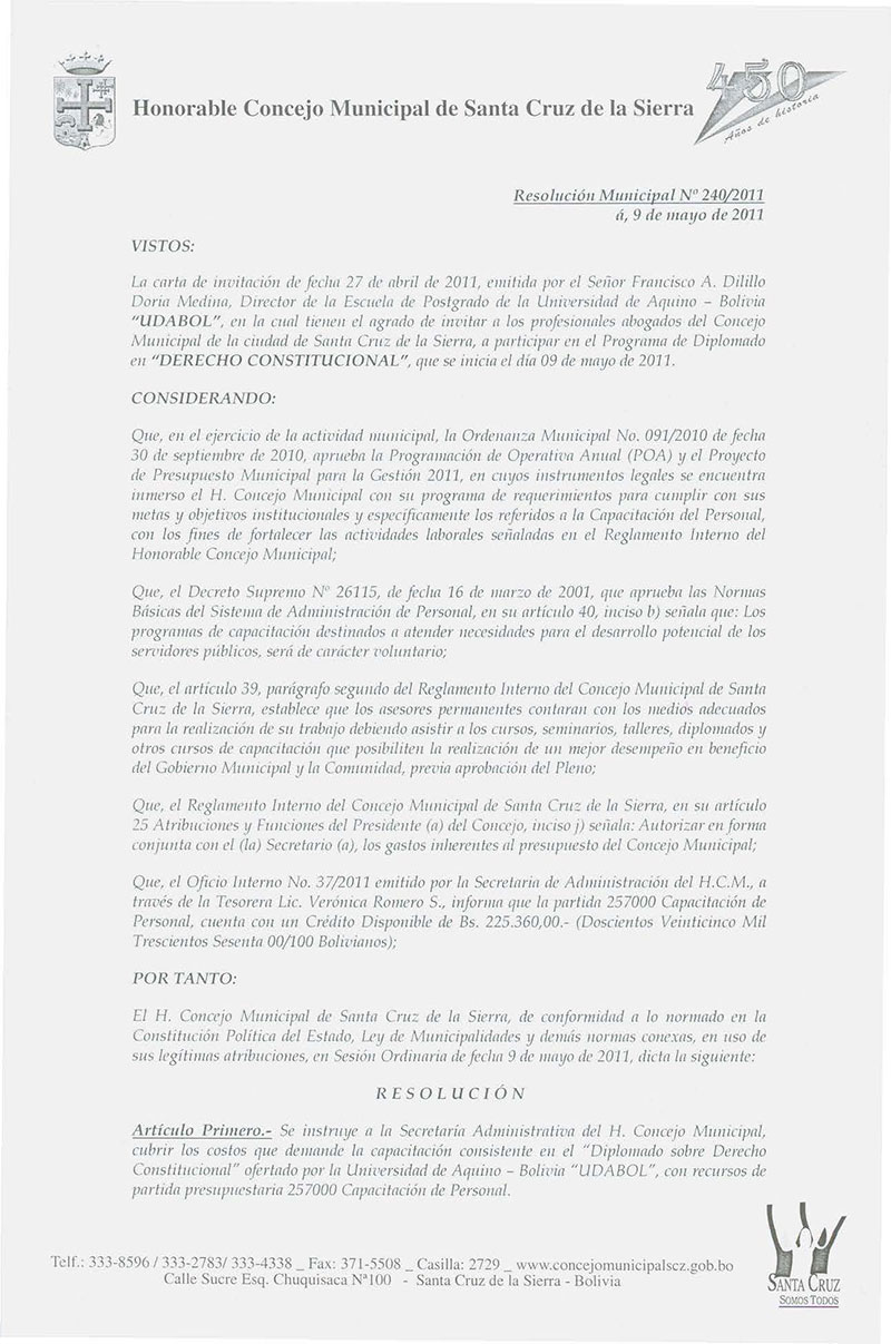 Instruye a la Secretaría Administrativa del Concejo Municipal, cubrir los costos que demande la capacitación del “Diplomado sobre Derecho Constitucional” ofertado por la Universidad de Aquino – Bolivia “UDABOL”.