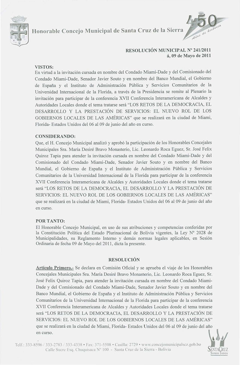 Declara en Comisión Oficial y se aprueba el viaje de los Honorables Concejales Municipales Sra. María Desiré Bravo Monasterio, Lic. Yanine Parada de Mercado, Lic. Leonardo Roca Egüez, Sr. Félix Quiroz Tapia, para asistir al curso “Los Retos de la Democracia".