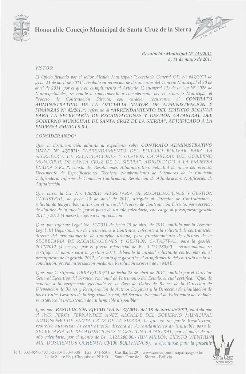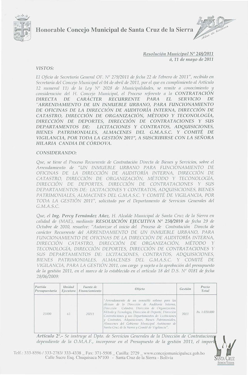 Aprueba el Contrato Administrativo OMAF Nº 31/2011, referente al Arrendamiento de inmueble Urbano Córdova I, para las Oficinas de la Dirección de Auditoría Interna, Dirección de Catastro, Dirección de Organización, Método y Tecnología, Dirección de Deportes, Dirección de Contrataciones y sus Departamentos de: Licitaciones y Contratos, Adquisiciones, Bienes Patrimoniales, Almacenes y Comité de Vigilancia, por la Gestión 2011”, por el monto de Bs. 85.000,00.