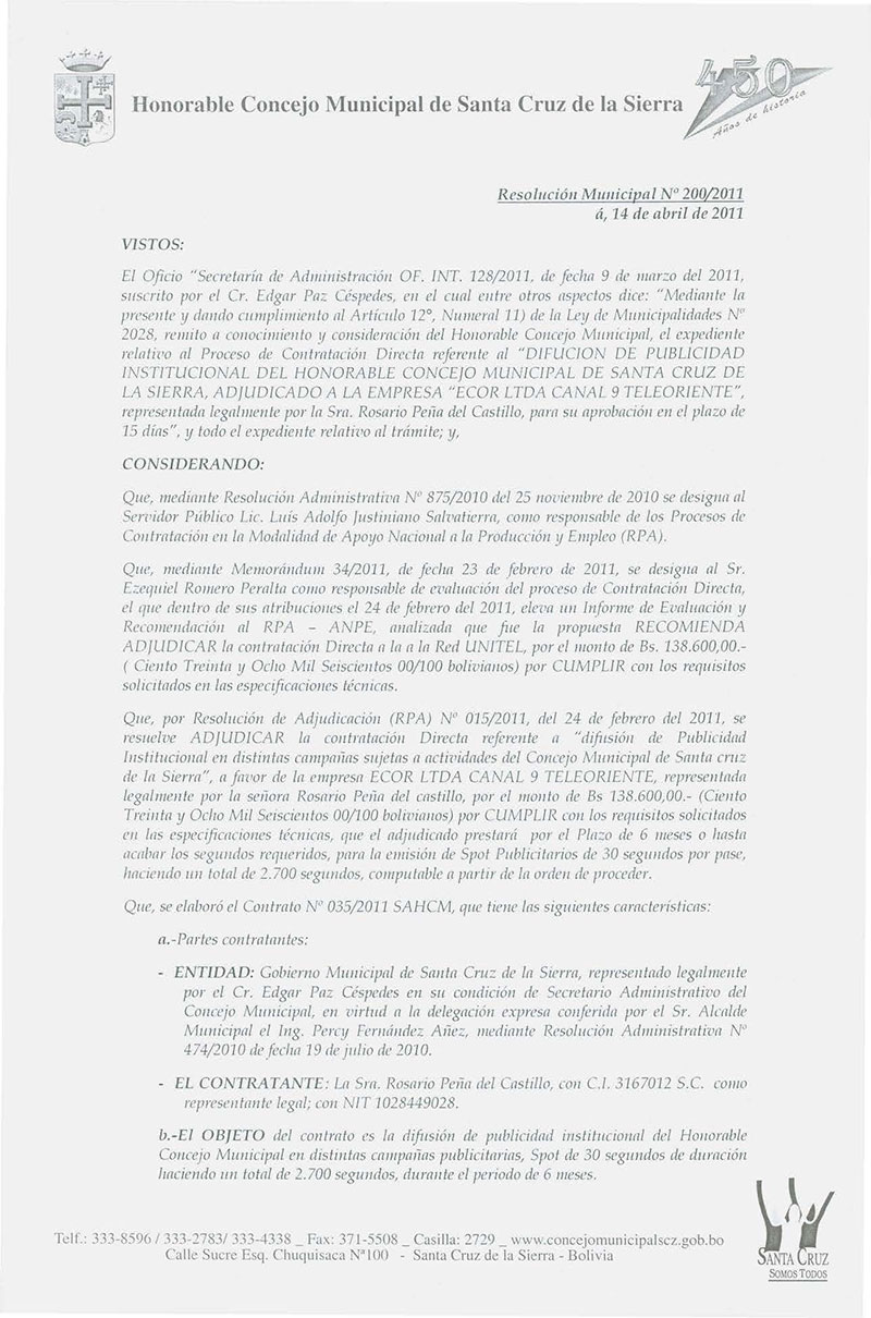 Aprueba el CONTRATO ADMINISTRATIVO No. 035/2011, PARA LA DIFUSIÓN DE PUBLICIDAD INSTITUCIONAL DEL CONCEJO MUNICIPAL DE SANTA CRUZ.