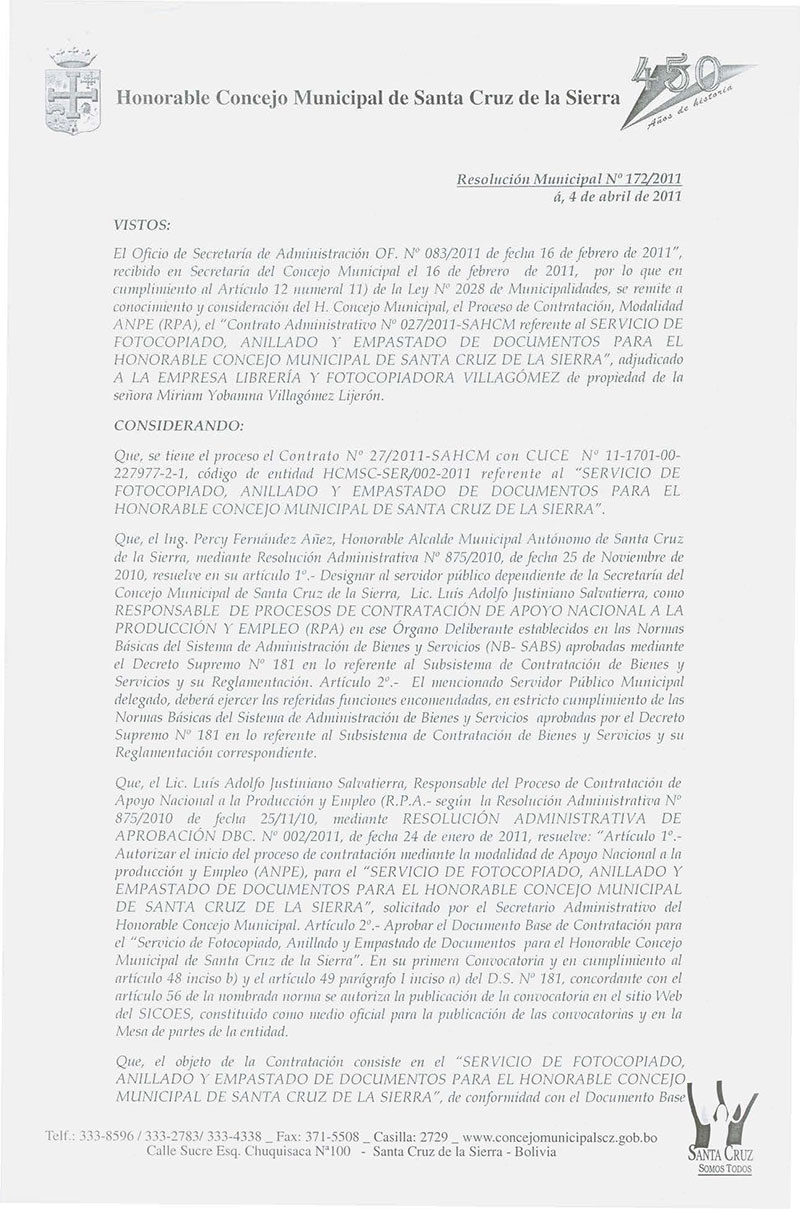Aprueba el Contrato Administrativo Nº 27/2011 SAHCM, para la prestación del “SERVICIO DE FOTOCOPIADO, ANILLADO Y EMPASTADO DE DOCUMENTOS PARA EL CONCEJO MUNICIPAL DE SANTA CRUZ.
