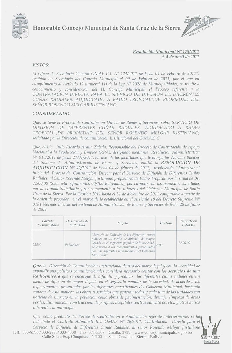 Aprueba el Contrato No. 037/2011 SAHCM, para la Contratación directa del “SERVICIO DE DIFUSIÓN DE PUBLICIDAD INSTITUCIONAL DEL CONCEJO”.