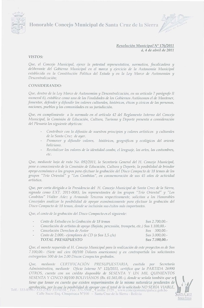 AUTORIZA, al Secretario de Administración del Concejo Municipal, a proceder apoyar económicamente la grabación del Disco Compacto de 18 temas, de los grupos “Trío Oriental” y “Los Cambitas”, en conmemoración de sus 45 años de actividad artística.