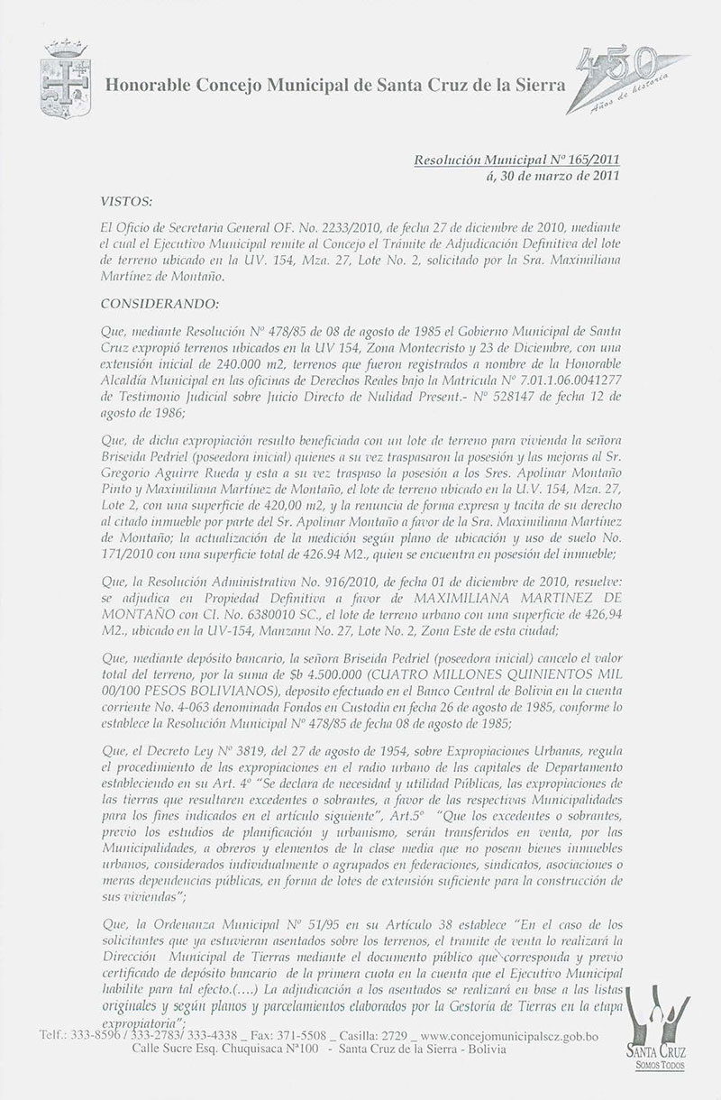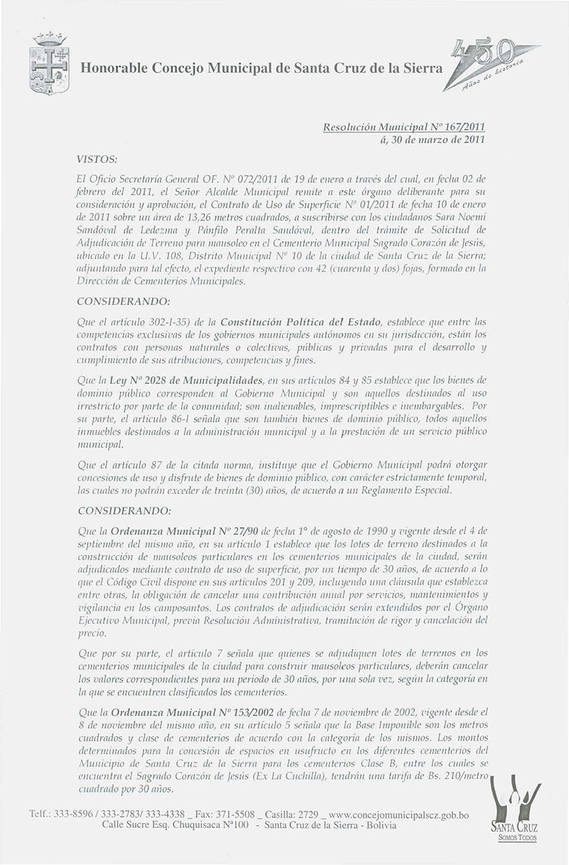 Aprueba el Contrato de Uso de Superficie Nº 01/2011 a suscribirse con los ciudadanos SARA NOEMÍ SANDÓVAL DE LEDEZMA Y PÁNFILO PERALTA SANDÓVAL, en calidad de adjudicatarios ocupado para mausoleo, situado en el Cementerio Municipal Sagrado Corazón de Jesús.