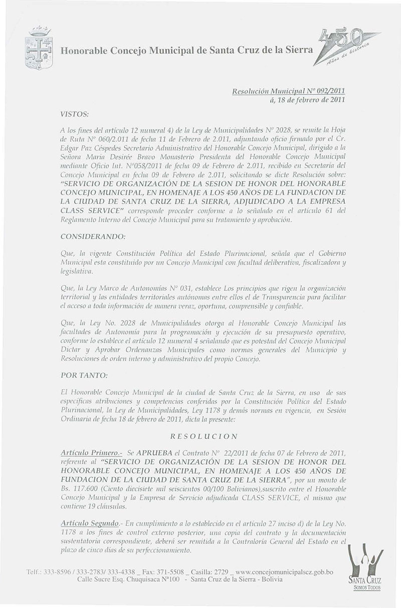 Aprueba el Contrato Nº 22/2011, referente al SERVICIO DE ORGANIZACIÓN DE LA SESION DE HONOR DEL HONORABLE CONCEJO MUNICIPAL, EN HOMENAJE A LOS 450 AÑOS DE FUNDACION DE LA CIUDAD DE SANTA CRUZ.