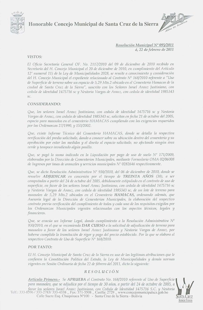Aprueba el Contrato No. 168/2010 referente al uso de Superficie para mausoleo, que se adjudica a favor los señores Israel Arauz Justiniano y Nestoria Vargas de Arauz, sobre un espacio de terreno para Mausoleo en el Cementerio Municipal Hamacas.