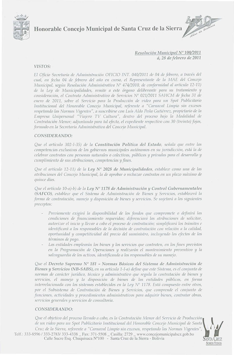 Aprueba el Contrato Administrativo Nº 021/2011 SAHCM, relativo a la Producción de video para Spot Publicitario Institucional del Honorable Concejo Municipal de Santa Cruz de la Sierra, referente a “Carnaval Limpio sin excesos, respetando las Normas Vigentes”.