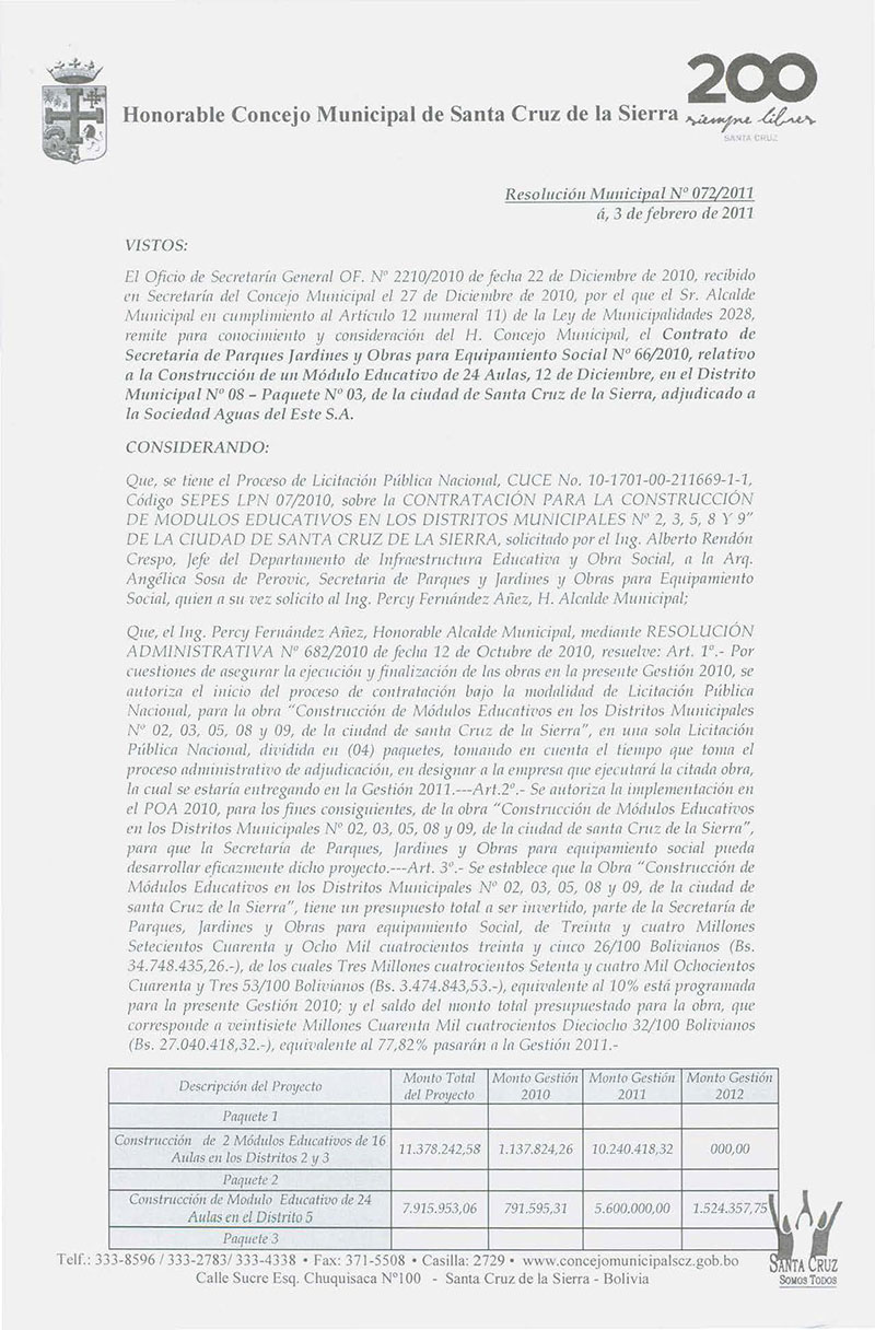 Aprueba el Contrato de la Secretaria de Parques Jardines y Obras para Equipamiento Social Nº 66/2010, referente a la CONSTRUCCIÓN DE UN MÓDULO EDUCATIVO DE 24 AULAS, 12 DE DICIEMBRE, EN EL DISTRITO MUNICIPAL Nº 08 – PAQUETE Nº 03, DE LA CIUDAD.