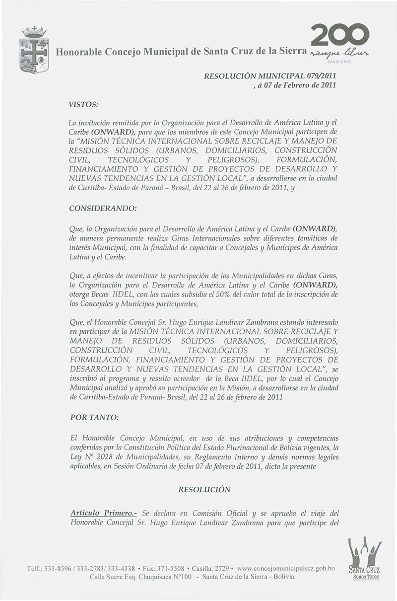 Declara en Comisión Oficial y se aprueba el viaje del H. Concejal Sr. Hugo Enrique Landivar Zambrana para participar del evento “Misión técnica internacional sobre reciclaje y manejo de residuos sólidos(Urbanos, domiciliarios, construcción civil, tecnológicos y peligrosos), a efectuarse en la ciudad de Curitiba - Estado de Paraná – Brasil.