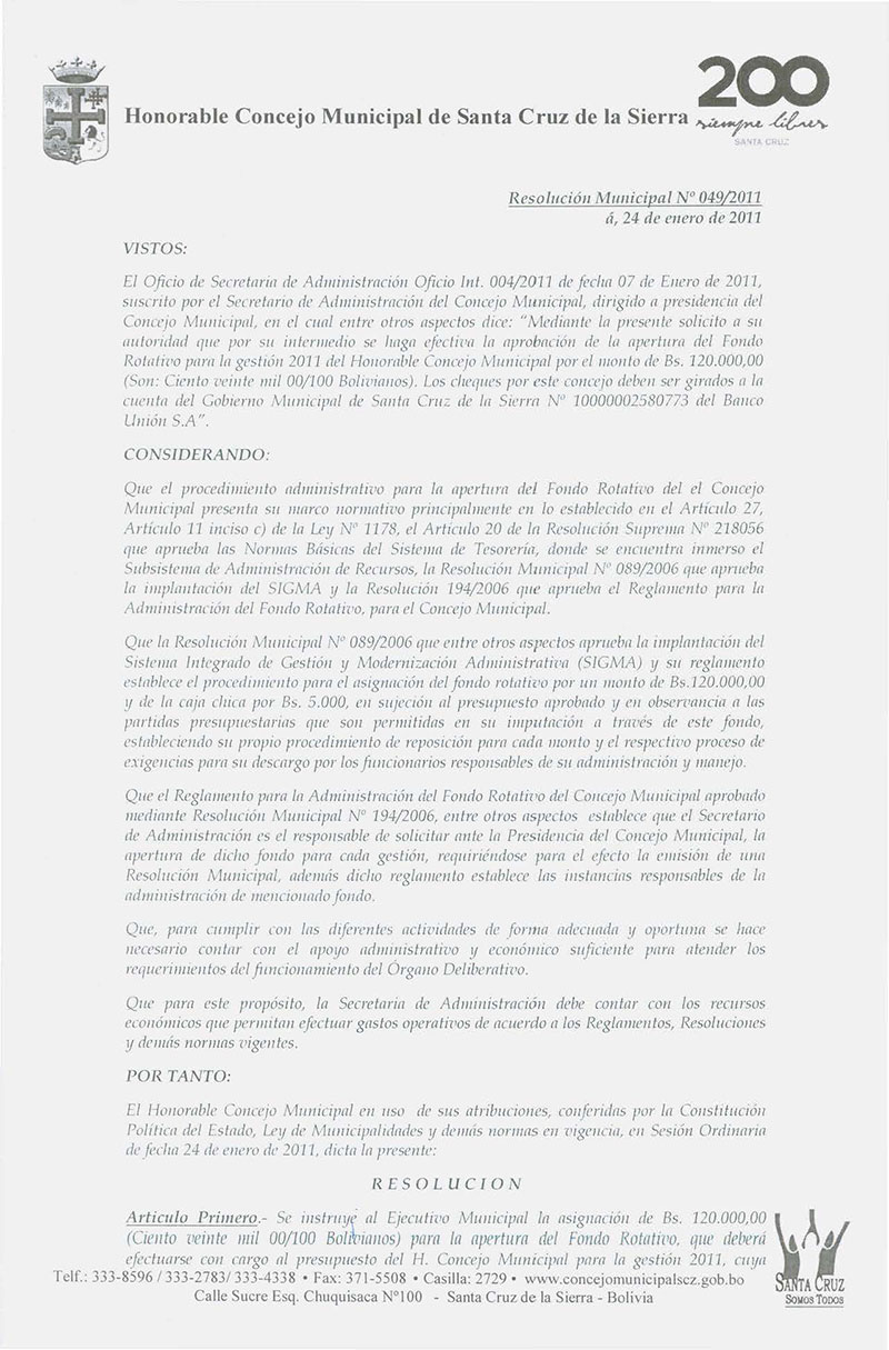 Instruye al Ejecutivo Municipal la asignación de Bs. 120.000,00 para la apertura del Fondo Rotativo, que deberá efectuarse con cargo al presupuesto del Concejo Municipal para la gestión 2011.
