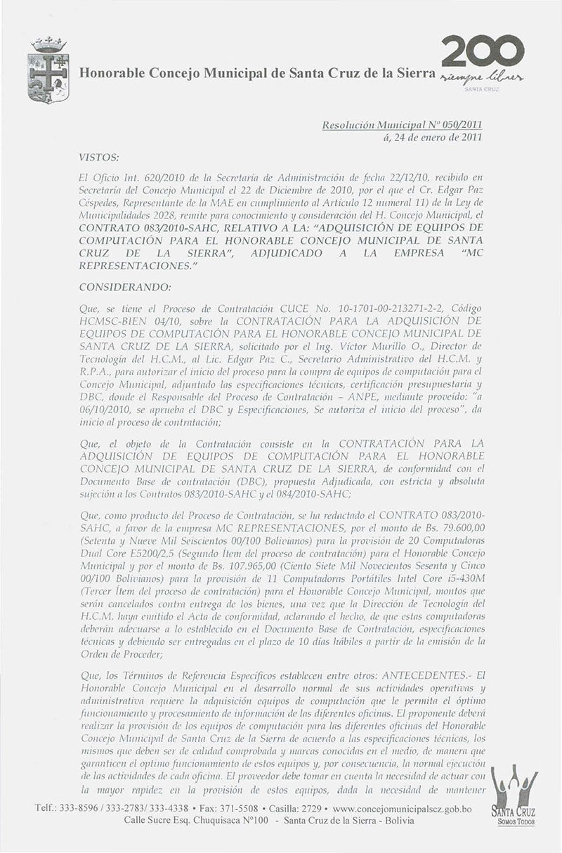 Aprueba el Contrato 083/2010-SAHC, a favor de la empresa MC REPRESENTACIONES, para la provisión de 20 Computadoras Dual Core E5200/2,5 para el Honorable Concejo Municipal y para la provisión de 11 Computadoras Portátiles Intel Core i5-430M.