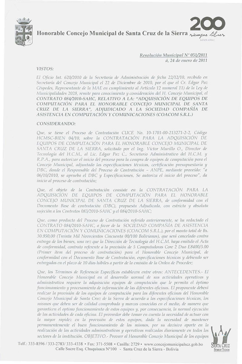 Prueba el Contrato 084/2010-SAHC, referente a la provisión de 5 Computadoras Core 2 Duo E8400/3.00 para el Honorable Concejo Municipal.