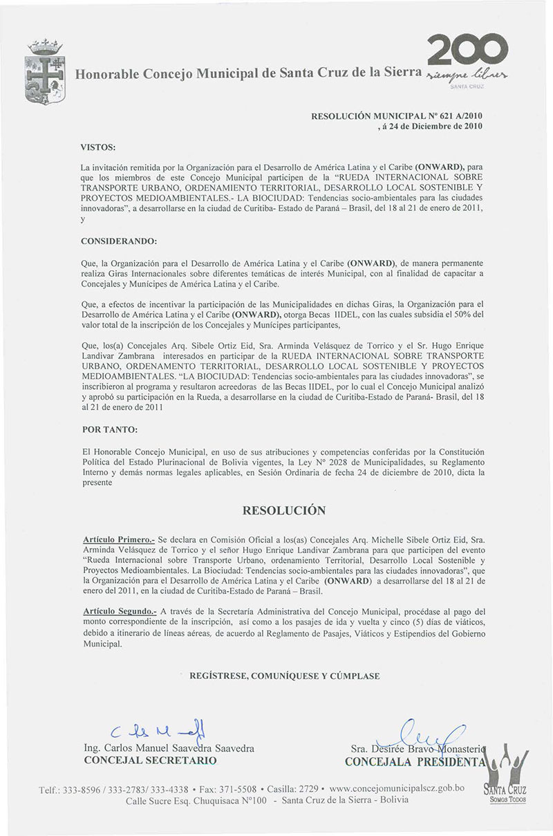 Declara en comisión oficial y aprueba el viaje a la ciudad de Curitiba - Brasil, de los Concejales Enrique Landivar, Sibele Ortiz y Arminda Velasquez, a participar del Evento Rueda Internacional sobre Transporte Urbano Ordenamiento Territorial, Desarrollo Local Sostenible y proyectos medioambientales, La Biociudad, a desarrollarse del 18 al 21 de enero de 2011, en la ciudad de Curitiba - Estado de Paraná - Brasil.
