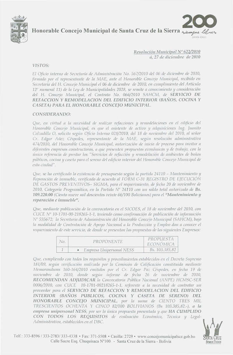 Aprueba el Contrato SAHCM Nº 066/2010, referente al servicio de refacción y remodelación del edificio interior (baños públicos, cocina y caseta del sereno) para el Honorable Concejo Municipal, por el monto total de Bs. 103.358,82.