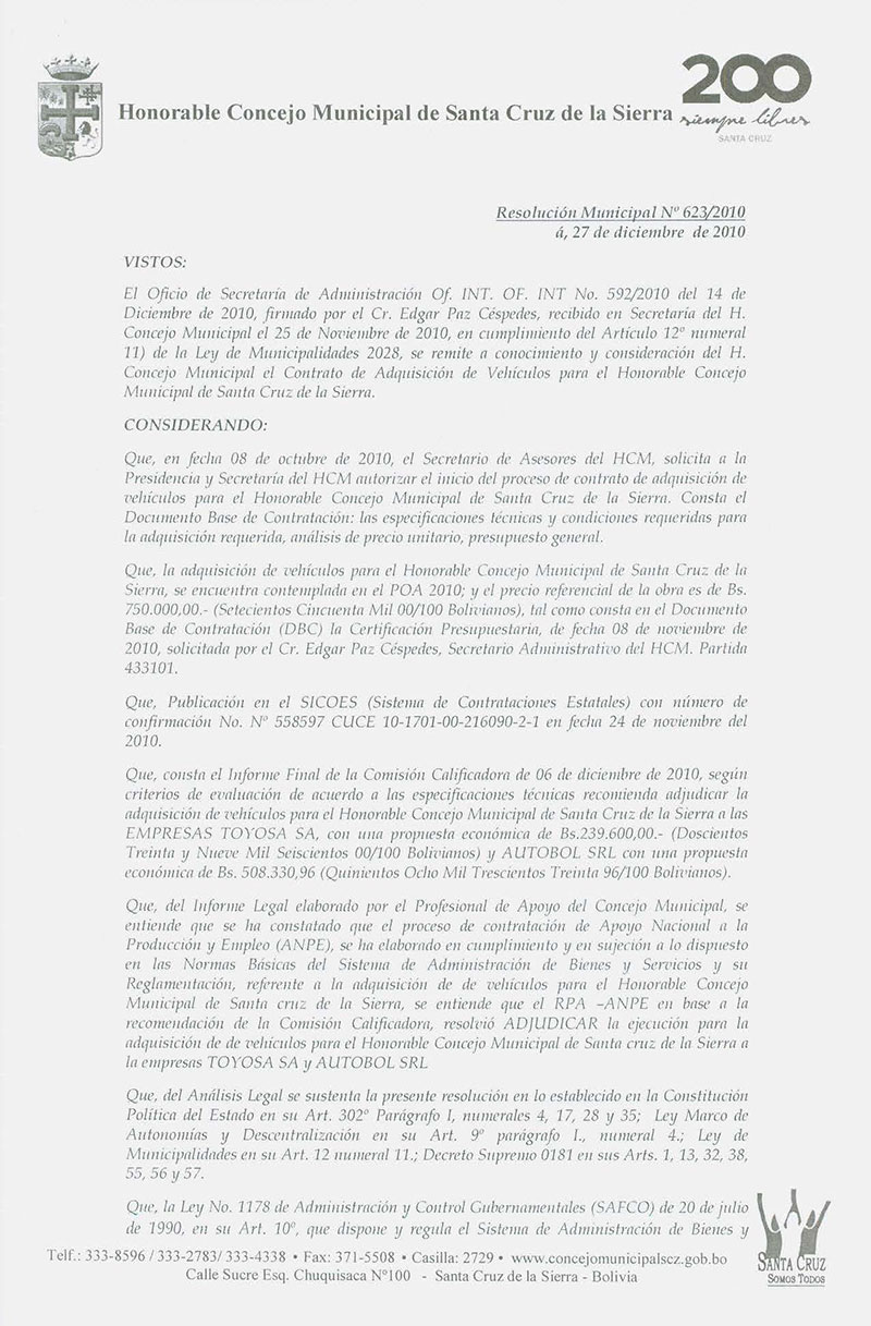 Aprueba el Contrato Administrativo SAHCM Nº 079/2010 y SAHCM N° 80/2010, referente a la adquisición de vehículos para el Concejo Municipal de Santa Cruz de la Sierra, por el monto de Bs. 239.600,00.