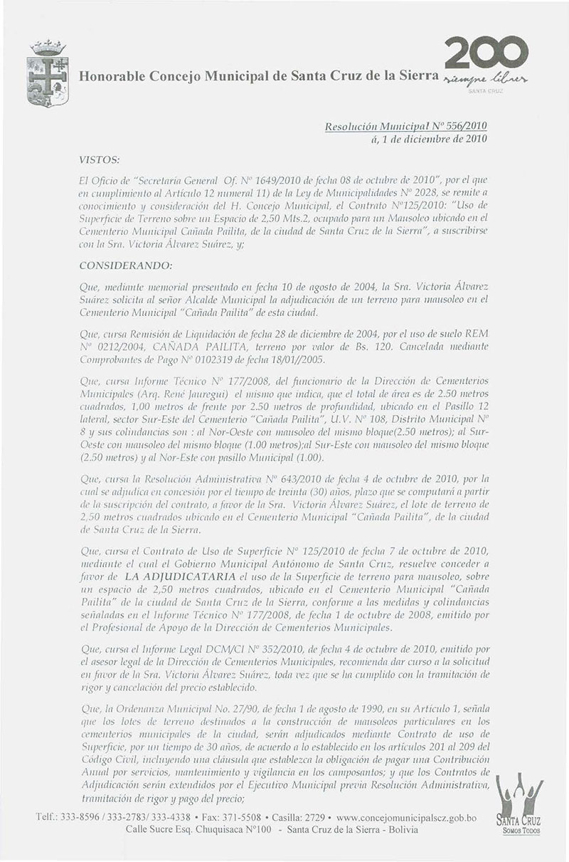 Aprueba el Contrato Nº 125/2010, de Uso de Superficie de Terreno ocupado por un mausoleo que se adjudica a favor de la Sra. Victoria Álvarez Suárez, ubicado en el Cementerio Cañada Pailita.