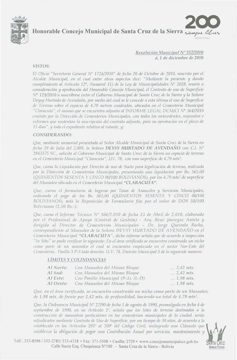 Aprueba el Contrato Nº 129/2010, de Uso de Superficie de Terreno ocupado por un Mausoleo ubicado en el Cementerio Clara Cuta, adjudicado favor de la Sra. Deysy Hurtado de Avendaño.
