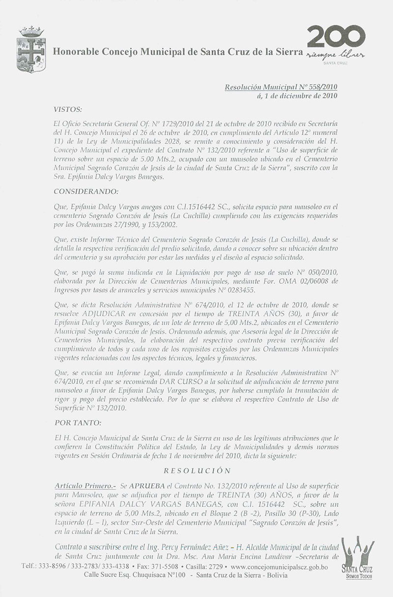 Aprueba el Contrato Nº 132/2010 referente al Uso de Superficie de terreno para Mausoleo, que se adjudica a favor de la Sra. Epifania Dalcy Vargas Banegas, ubicado en el Cementerio Municipal Sagrado Corazón de Jesús.
