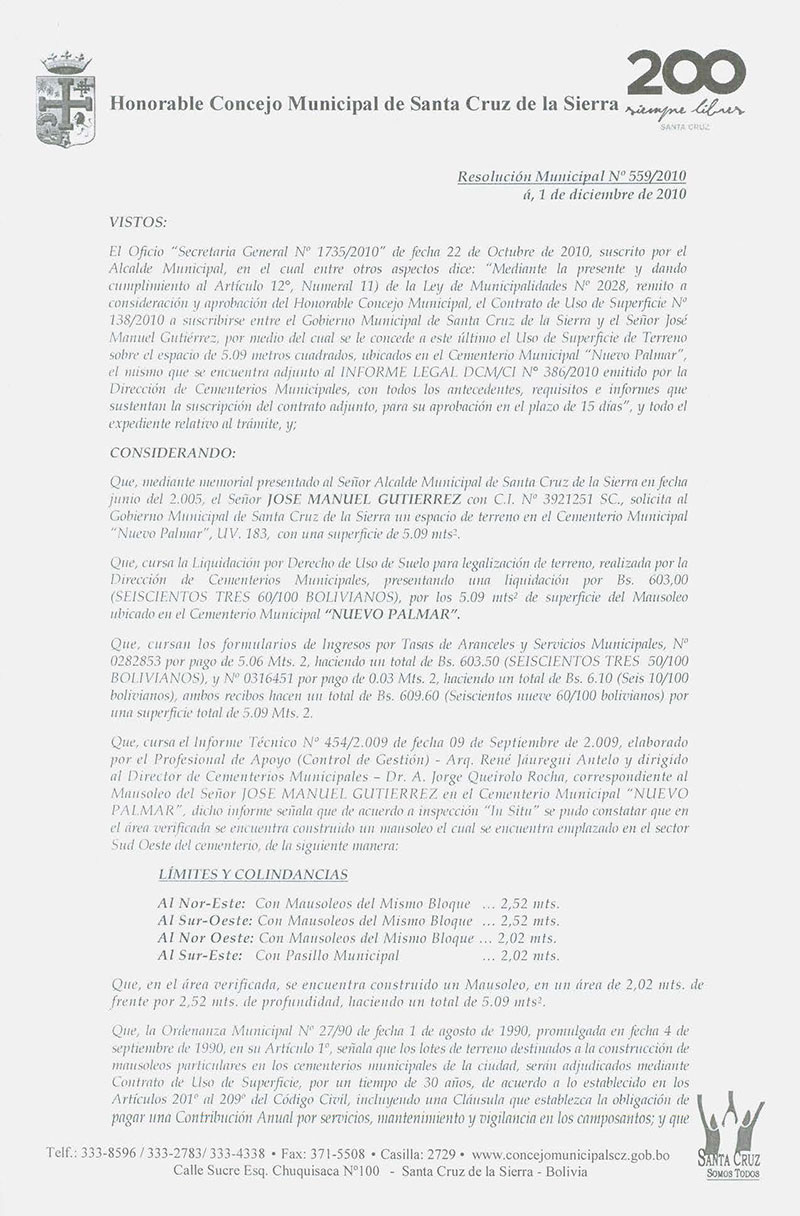 Aprueba el Contrato Nº 138/2010 referente al Uso de Superficie de Terreno ocupado con un Mausoleo, a favor del Sr. José Manuel Gutiérrez, ubicado en el Cementerio "Nuevo Palmar".