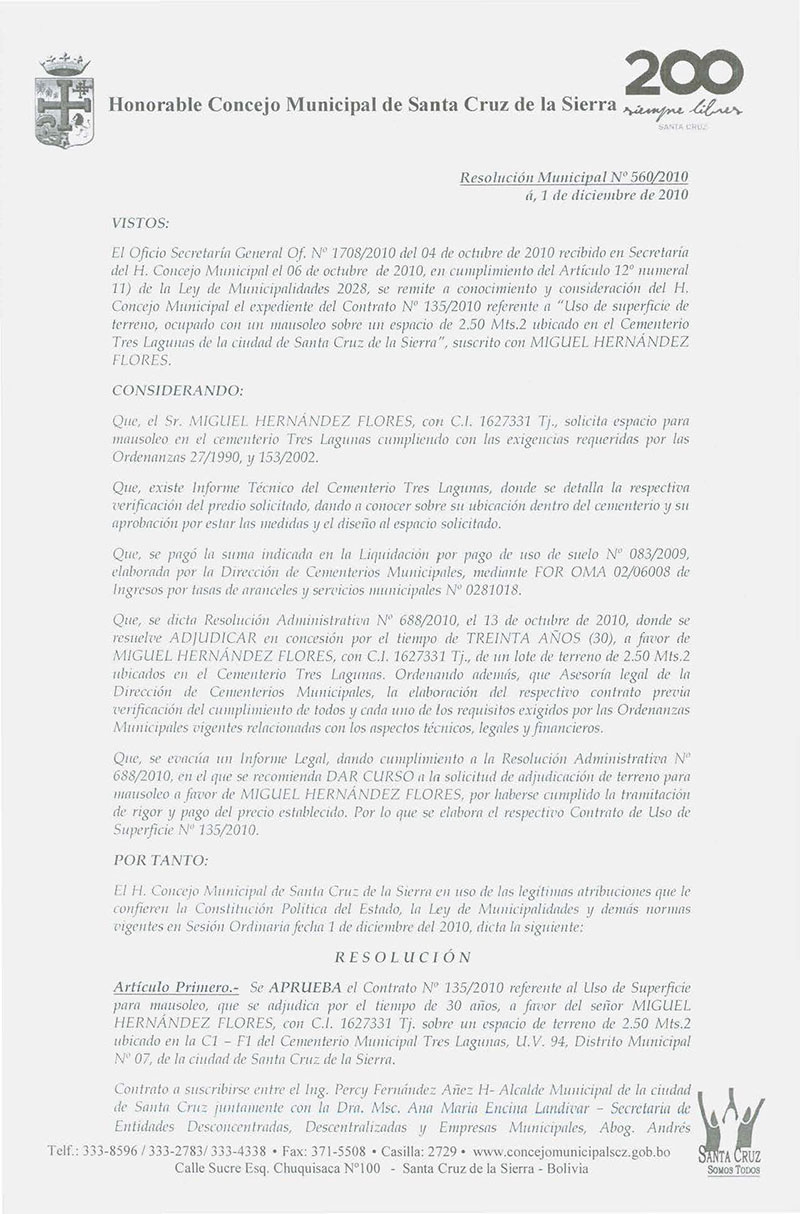 Aprueba el Contrato Nº 135/2010, de Uso de Superficie de terreno ocupado para Mausoleo que se adjudica a favor del Sr. Miguel Hernández Flores, ubicado en el Cementerio Tres Lagunas.