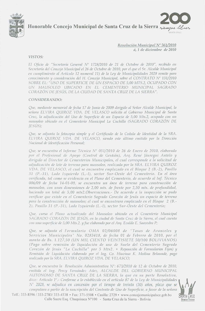 Aprueba el Contrato Nº 131/2010 referente al Uso de Superficie para Mausoleo, adjudicado a favor de la Sra. Elvira Quiroz Vda. De Velasco, ubicado en el Cementerio Sagrado Corazón de Jesús.