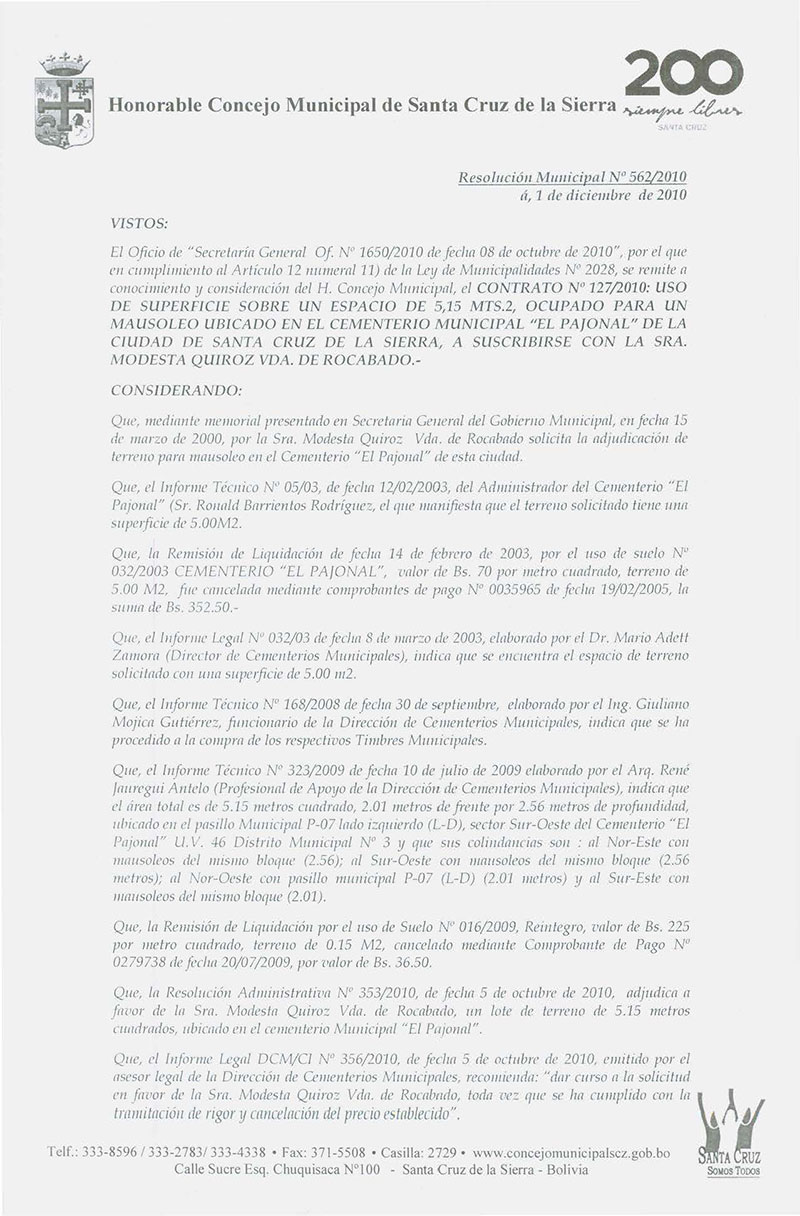 Aprueba el Contrato Nº 127/2010 referente al Uso de Superficie de Terreno para mausoleo que se adjudica a favor de la Sra. Modesta Quiroz Vda. De Rocabado, ubicado en el Cementerio El Pajonal.