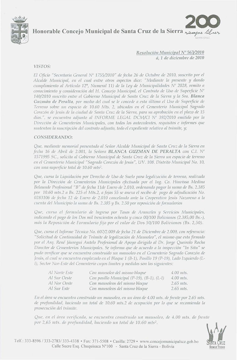 Aprueba el Contrato Nº 140/2010 referente al Uso de Superficie de Terreno ocupado con un Mausoleo a favor de la Sra. Blanca Guzmán de Peralta, ubicado en el Cementerio Sagrado Corazón de Jesús.