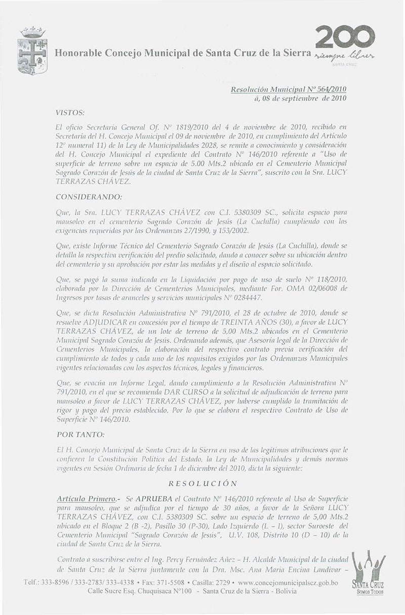 Aprueba el Contrato Nº 146/2010 referente al Uso de Superficie de terreno para Mausoleo ubicado en el Cementerio Sagrado Corazón de Jesús, que se adjudica a favor de la Sra. Lucy Terrazas Chávez.