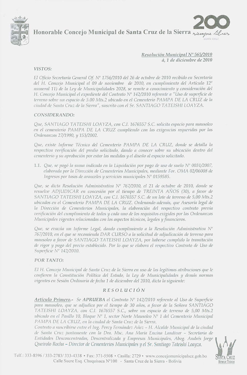 Aprueba el Contrato Nº 142/2010 referente al Uso de Superficie de terreno para Mausoleo ubicado en el Cementerio Pampa de la Cruz, adjudicado a favor del Sr. Santiago Tateishi Loayza.
