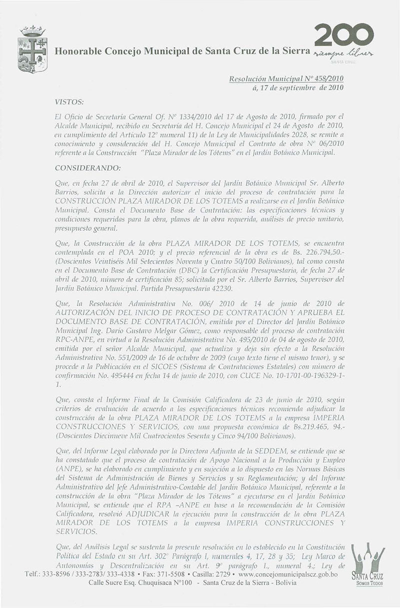 Aprueba la firma del Contrato UOJBM 06/2010, referente a la Construcción de la "Plaza Mirador de los Tótems" en el Jardín Botánico Municipal, por Bs. 219.465,94.