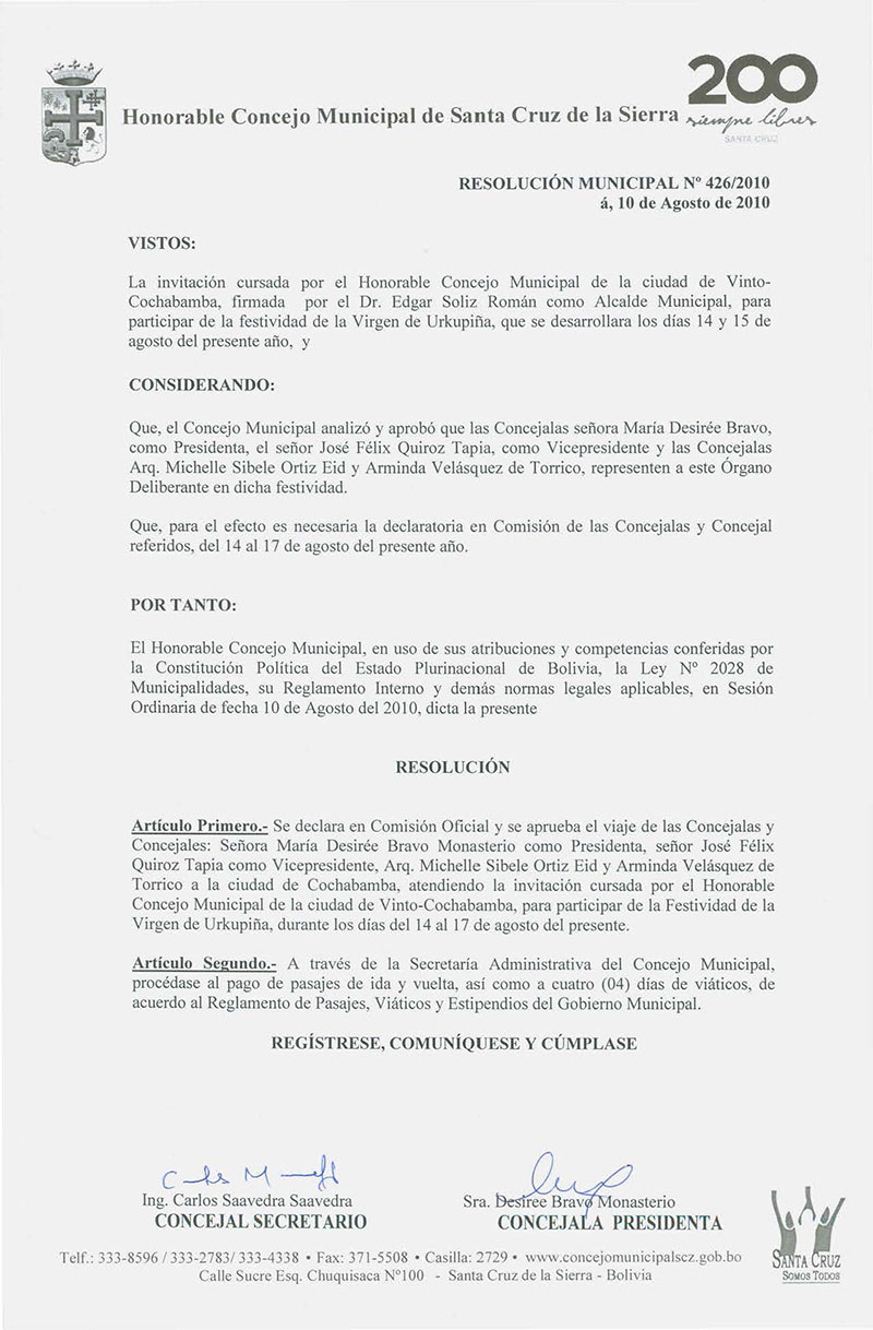 Declara en comisión oficial y aprueba el viaje a la Ciudad de Cochabamba de los Concejales: Desirée Bravo, José Félix Quiroz, Michelle Ortiz y Arminda Velásquez, a objeto de participar de la Festividad de la Virgen de Urkupiña.