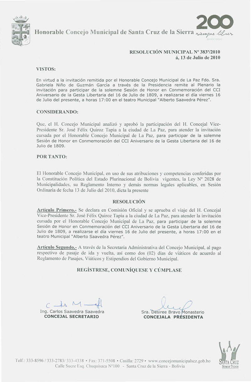 Declara en comisión oficial y aprueba el viaje del Concejal José Quiroz, a objeto de asistir al Aniversario de la Gesta del 16 de Julio.