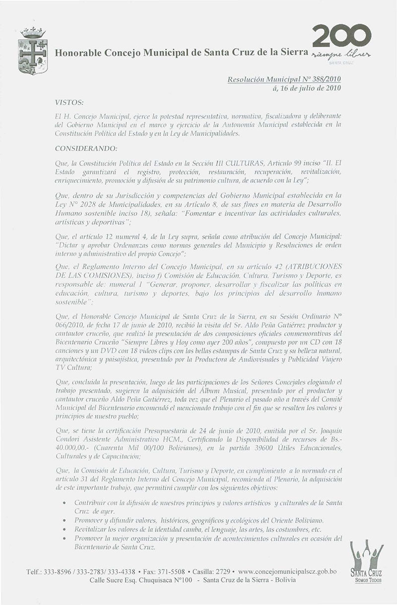 Autoriza al Secretario Administrativo del Concejo, a la adquisición del álbum de canciones conmemorativas al Bicentenario "Siempre Libres" y "Hoy como Ayer 200 Años", productora audiovisuales y publicidad viajero TV Cultura.