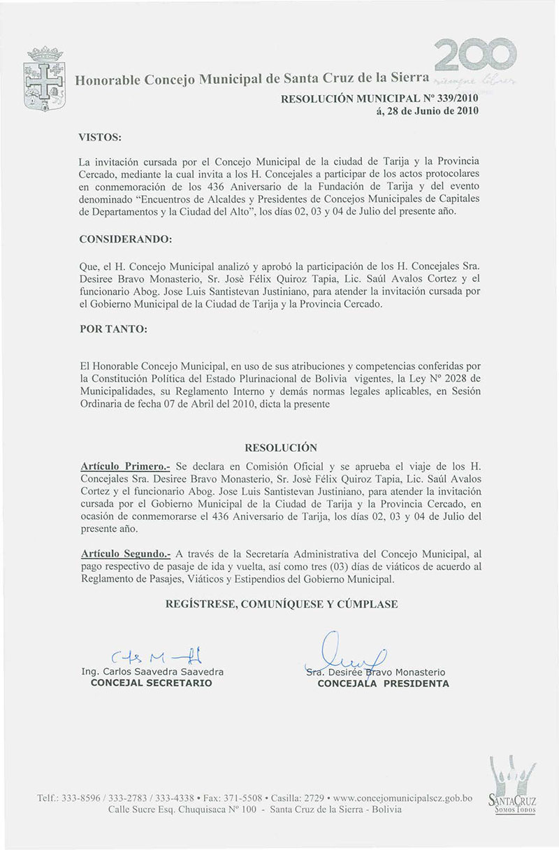 Declara en comisión oficial y aprueba el viaje a Tarija de los Concejales Sra. Desiree Bravo, Saúl Avalos, José Quiroz y del Asesor Dr. José Luis Santistevan, a participar de su aniversario.
