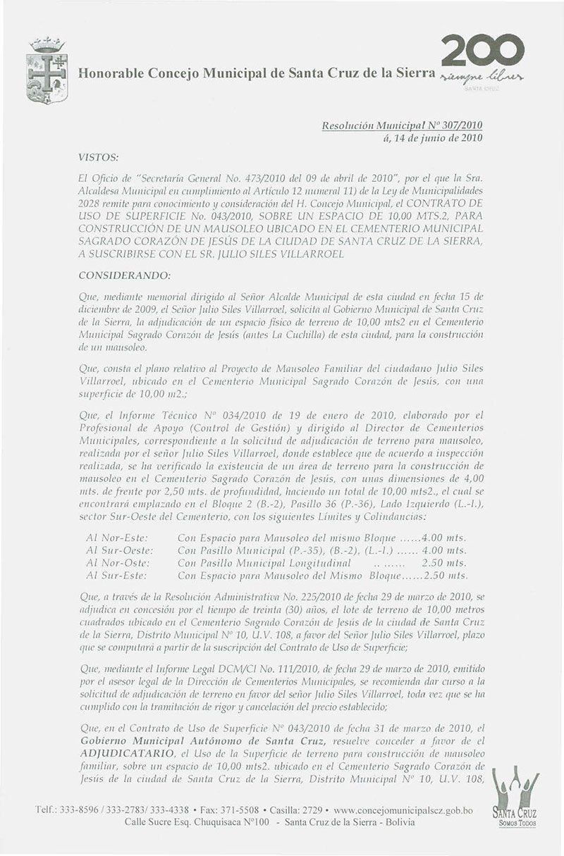 Aprueba el Contrato de Uso de Superficie Nº 043/2010, para construcción de Mausoleo ubicado en el Cementerio Sagrado Corazón de Jesús, a favor del Sr. Julio Siles Villarroel.