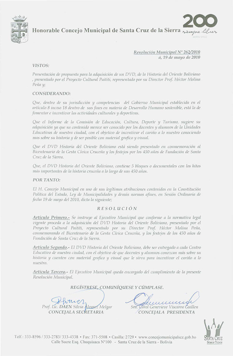 Instruye al Ejecutivo Municipal proceda a la adquisición del DVD - Historia del Oriente Boliviano, presentado por el Proyecto Cultural Paitití, en homenaje a los festejos de los 450 años de Fundación de Santa Cruz de la Sierra.