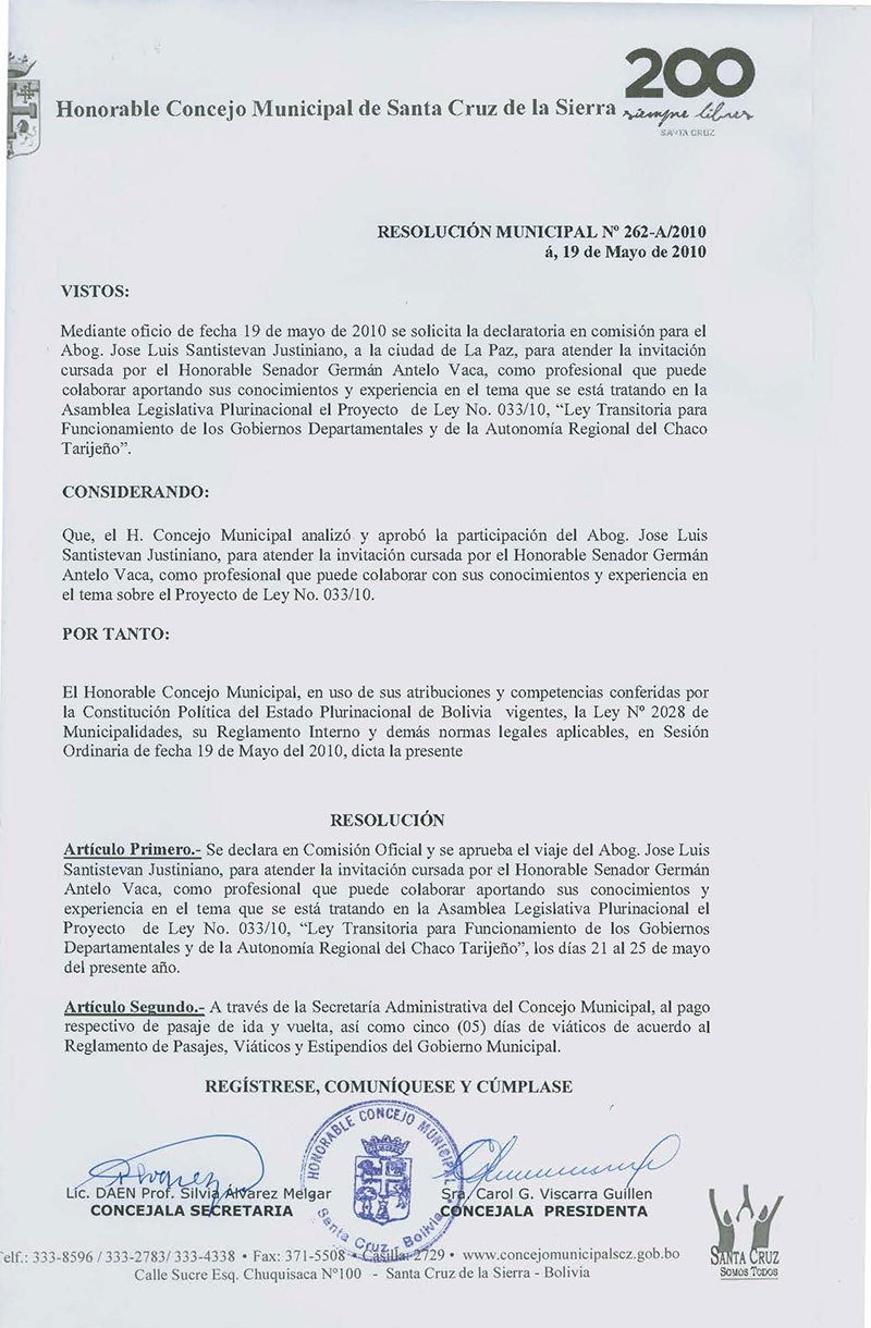 Declara en comisión oficial y aprueba el viaje del Abog. José Luis Santistevan Justiniano, para atender la invitación del Senador Germán Antelo, para participar y aportar en el Proyecto de la Ley Transitoria para Funcionamiento de los Gobiernos Departamentales y Autonomía del Chaco Tarijeño.
