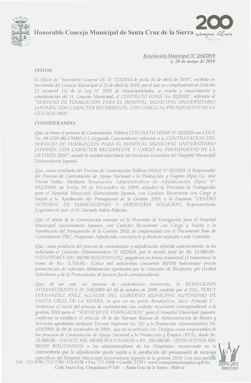Aprueba el Contrato HMUJ Nº 002/2010, referente al Servicio de Fumigación para el Hospital Japonés.