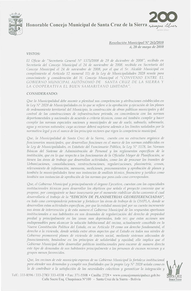 Rechaza el Convenio suscrito entre el Gobierno Municipal y la Cooperativa El Buen Samaritano Ltda., para desarrollar el trabajo de la Edición de Planimetría Georeferenciadas.