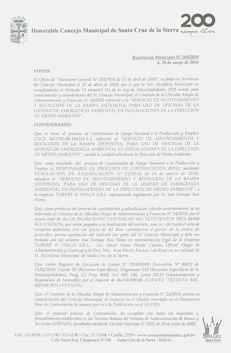 Aprueba el Contrato OMAF Nº 024/2010, referente al Servicio de Mantenimiento y Refacción de la Rampa (depósito), para uso de oficinas de la Unidad de Emergencia Ambiental en Instalaciones de la Dirección de Medio Ambiente.
