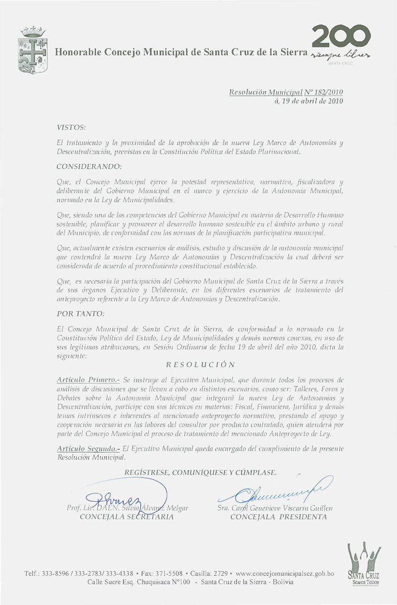 Se instruye al Ejecutivo Municipal, que durante todos los procesos de análisis de discusiones que se llevan en distintos escenarios como ser: Talleres, Foros y Debates sobre la Autonomía Municipal y Descentralización, participe con sus técnicos en materia: Fiscal, Financiera, Jurídica y demás temas.
