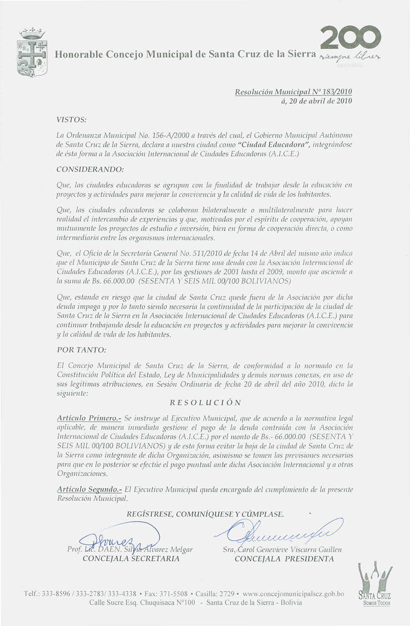 Instruye al Ejecutivo Municipal que de manera inmediata gestione el pago de la deuda contraída con la Asociación Internacional de Ciudades Educadoras (A.I.C.E.) y de esta manera evitar la baja de la Ciudad de Santa Cruz como integrante de dicha Organización.