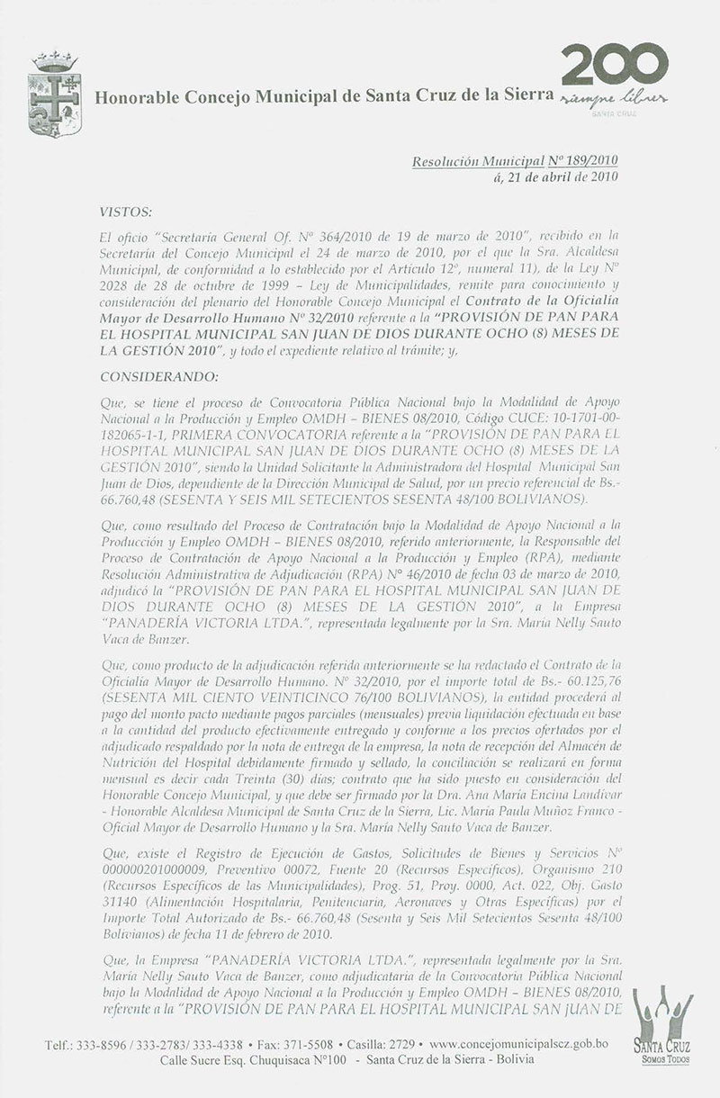 Aprueba el Contrato OMDH Nº 32/2010, referente a la Provisión de Pan para el Hospital San Juan de Dios durante 8 meses de la gestión 2010.