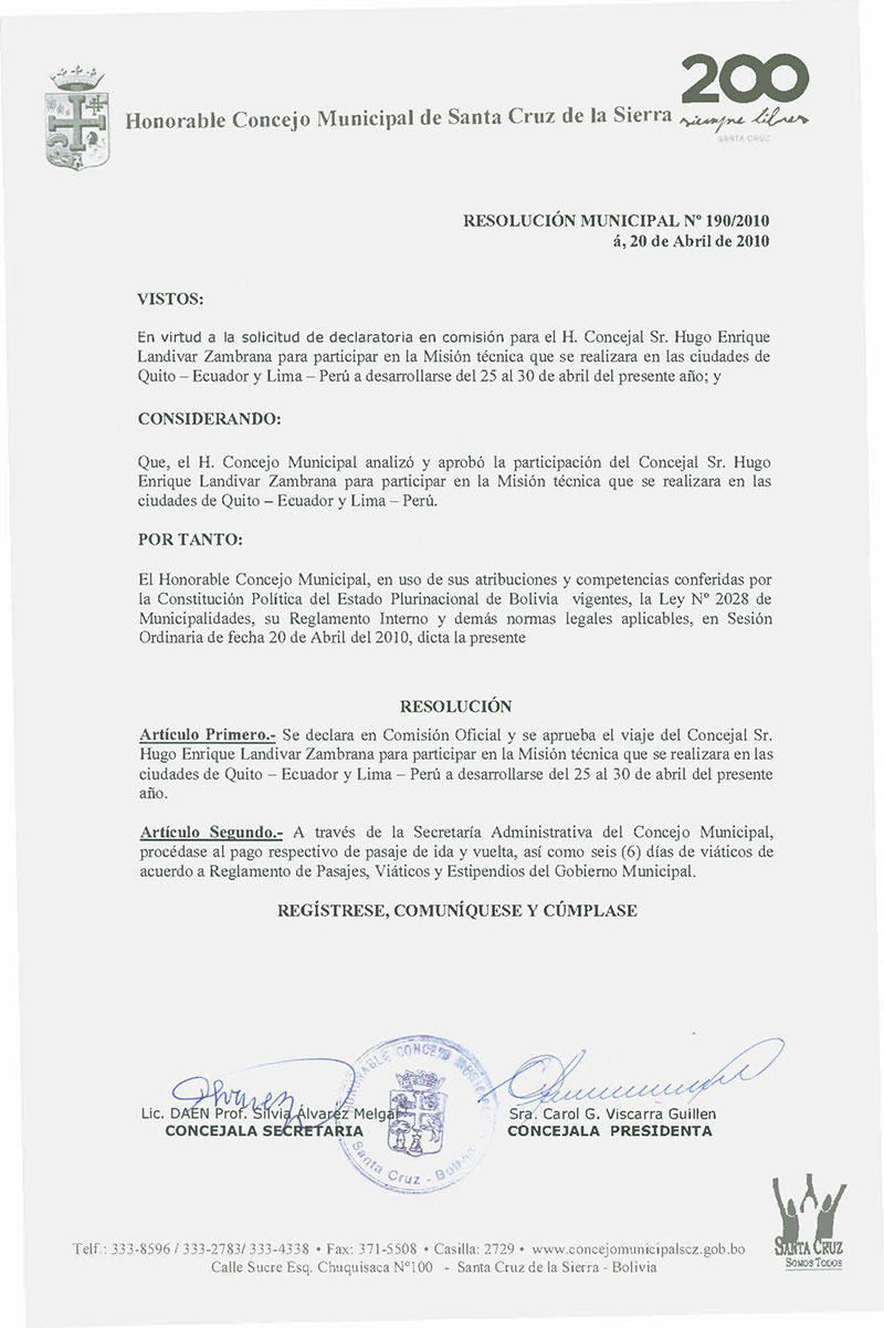 Declara en comisión oficial y aprueba el viaje del Concejal del Sr. Enrique Landivar, a objeto de participar de la Misión Técnica, a realizarse en Quito - Ecuador y Lima - Perú.